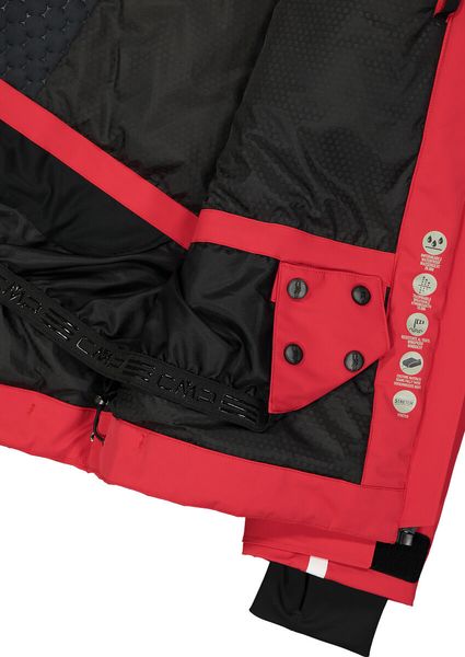 "The jacket is also equipped with practical features: an integrated snow guard prevents snow from getting in, while the Lycra-bu00fcndchen with thumb opening offer additional comfort. The adjustable hem with drawstring allows for a customized fit. Two side zipped pockets and a ski pass pocket on the sleeve offer plenty of storage space for important items. The front zip is fitted with a chin guard to prevent skin irritation"