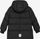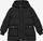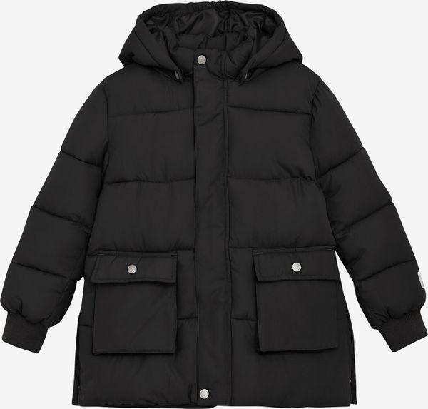 "Long, quilted jacket with hood and pockets, windproof and made from recycled material for cold days."
