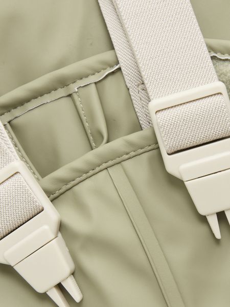 "The fleeceinside lining is particularly practical, providing comfortable warmth, while the adjustable hood offers additional protection. The rain trousers are designed as dungarees with adjustable straps and a plastic buckle up to size 104, while they are available from size 110 as regular trousers with an elasticated waistband. Both versions have elasticated foot loops that can be worn under the boots to prevent them from slipping."