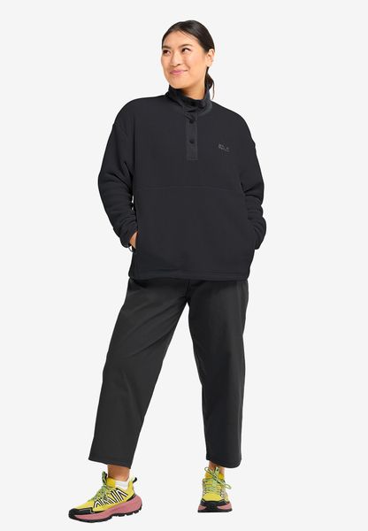 "The SUMETRO Half Zip W by Jack Wolfskin is a versatile fleece sweater for women that is ideal for everyday wear and leisure activities. With its loose cut and soft nylon material, it offers a high level of comfort and freedom of movement, perfect for urban exploration or relaxed outings. The half-zip fastening makes it easy to adjust the ventilation, while the two zipped pockets on the hips offer practical storage space. The adjustable hem ensures an individual fit and the poppers give the sweater a modern look. With a back length of 64.5 cm, it is perfect for any occasion and can be easily combined with other items of clothing."