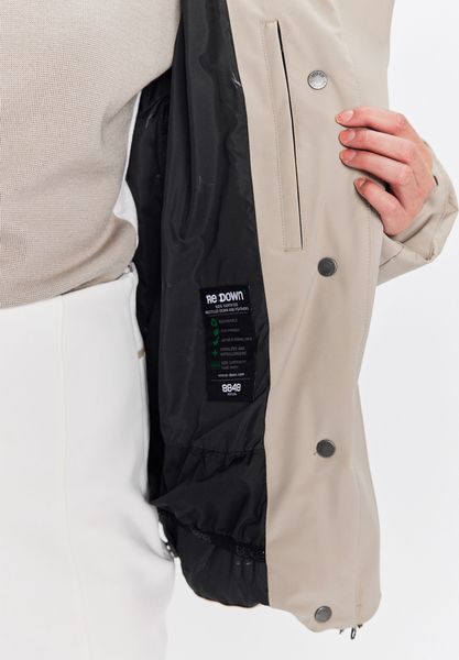 "The Delaine Ski Jacket from 8848 Altitude combines stylish elegance with outstanding functionality. This jacket impresses with its flattering silhouette and accentuated waist, which cuts a fine figure not only on the ski slopes but also in everyday winter life. With waterproof protection of 10,000 mm and breathability of 5,000 g/mu00b2/24h, it offers optimum comfort in Scandinavian weather and keeps you reliably warm and dry. The innovative 3L Rohr WP construction ensures that you are well equipped even in extreme weather conditions. An adjustable fixed belt at the back waist not only emphasizes the feminine fit, but also offers additional comfort and flexibilityu00e4t."