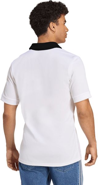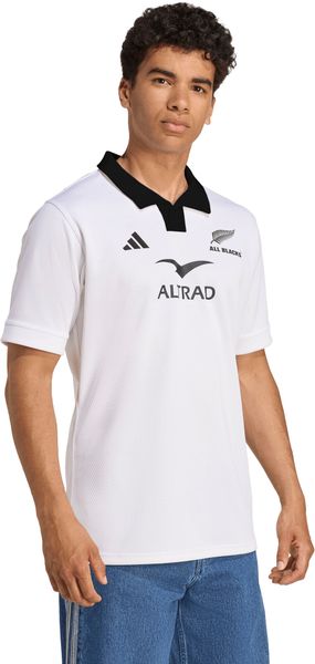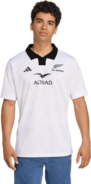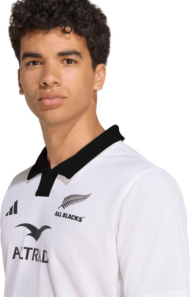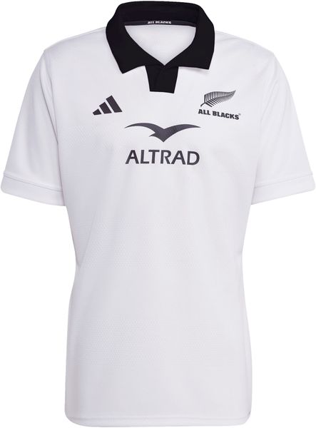 "The All Blacks Away Replica Jersey from adidas is more than just a jersey u2013 it is a symbol of the strength and tradition of New Zealand rugbyu00e4ndu2013s rugby teamu2013. Even when the All Blacks compete in white, their imposing presence remains unbroken. This fan shirt is a faithful replica of the jersey that the team wears in color clashes. The classic rugby look is emphasized by the elegant black polo collar and stylish trims, while the embossed stripes give the jersey a dynamic touch."