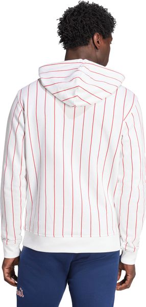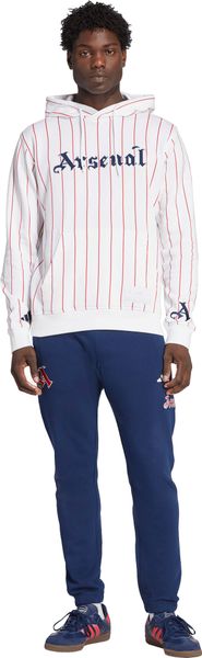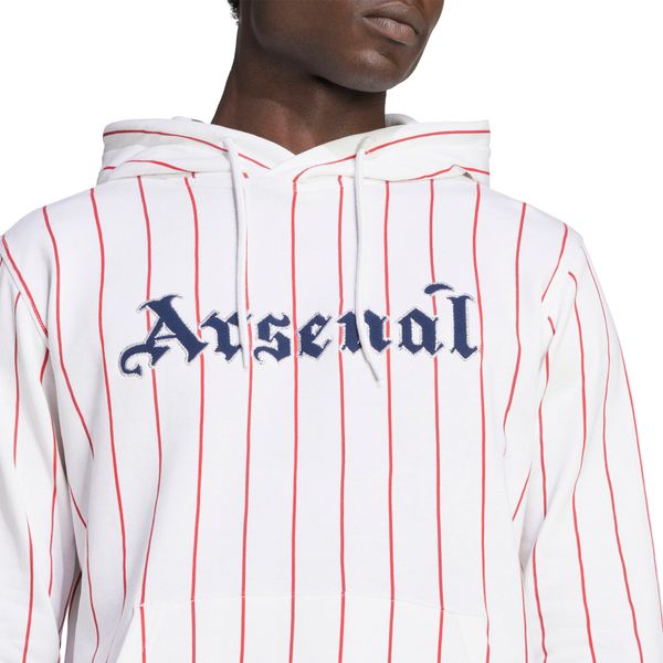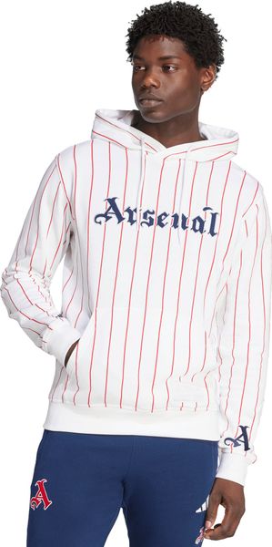 "Show your passion for Arsenal in unmistakable USA style with this adidas football hoodie. The design combines baseball-inspired pinstripes with eye-catching lettering reminiscent of a vintage club logo, adding the finishing touch to your matchday look. Made from soft French terry, this hoodie is comfortable to wear whether you're watching the game with your friends or just relaxing in front of the TV. The regular fit and hood with drawstring fastening ensure a perfect fit and additional comfort. Practical and stylish at the same time, the drawstring pocket offers space for your essentials. With a material blend of 95% cotton and 5% elastane, the hoodie is not only comfortable, but also slightly stretchy, which ensures additional comfort. The Arsenal graphics make a strong statement and show your support for the club in style."