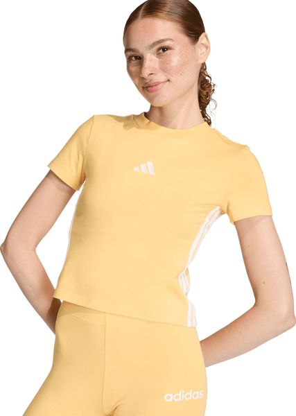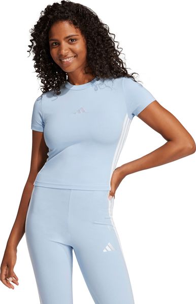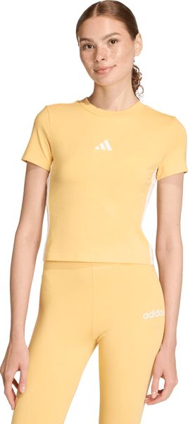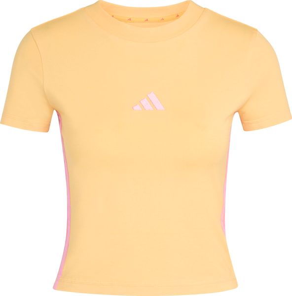 "The adidas Essentials 3 Stripes Slim Baby T-Shirt brings a breath of fresh air to the classic look. This stylish Tshirt is perfect for fitness and training and offers an ideal fit for the body thanks to its slim fit. The round neckline provides additional comfort and freedom of movement, while the high-quality material blend of 93% cotton and 7% elastane ensures a comfortable feel. The iconic 3stripes logo on the chest gives the shirt a sporty touch that blends seamlessly into your everyday outfit. Whether worn with joggers or jeans, this T-shirt is a versatile companion for any occasion."