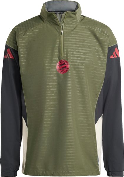 "The regular cut of the top ensures a comfortable fit, while the zipper up to the chest provides additional ventilation and flexibility. Made from 100% recycled polyester on the outside and inside as well as a middle layer of polyurethane, the top combines sustainability with functionality. The FC Bayern Mu00fcnchen club logo, which contrasts with the colors of the alternate kit, shows your support for the club, whether in bright sunshine or rainu2013."