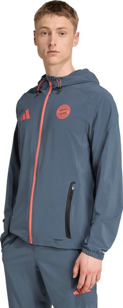 "Travel in style and show your club pride with the FC Bayern Mu00fcnchen Tiro25 Competition Vis Tech Travel Jacket from adidas. This jacket is not only a fashion statement, but also a technical masterpiece designed specifically for travel and everyday wear. The slim fit creates a modern silhouette, while the full-length zipper and adjustable hood with elasticated drawstring provide optimal protection from the elements. Made from 100% recycled polyester and equipped with AEROREADY technology, this jacket will keep you dry and comfortable wherever your journey takes you."