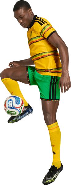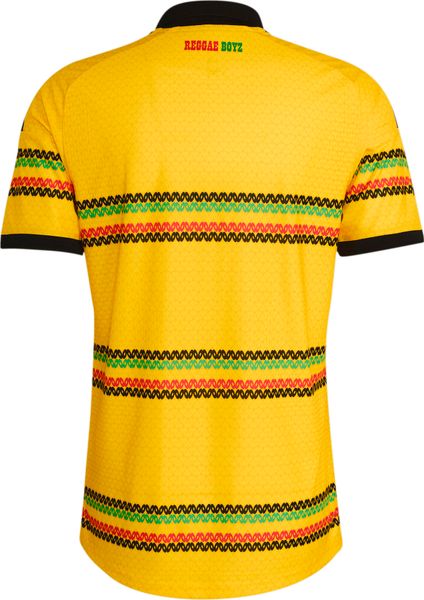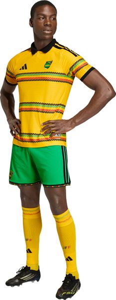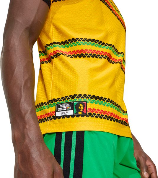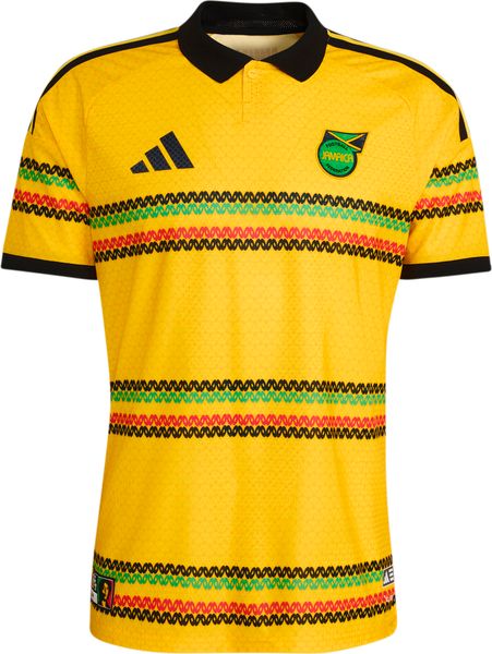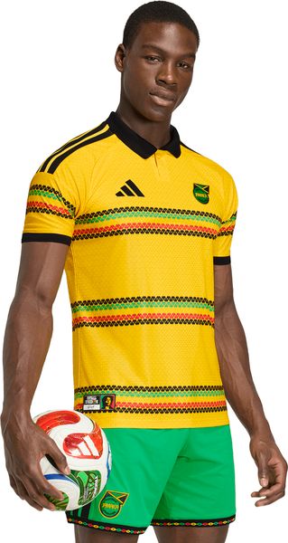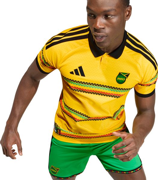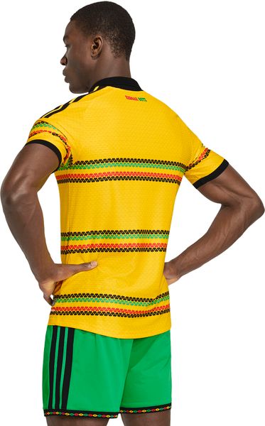 "Experience the unmistakable charm of reggae culture with the Jamaica 26 Home Authentic Jersey from adidas, which pays homage to the legacy of Bob Marley. This jersey combines traditional style with modern touches, featuring a sleek button placket and classic collar. The slim fit ensures a tailored fit that will impress both on and off the pitch."