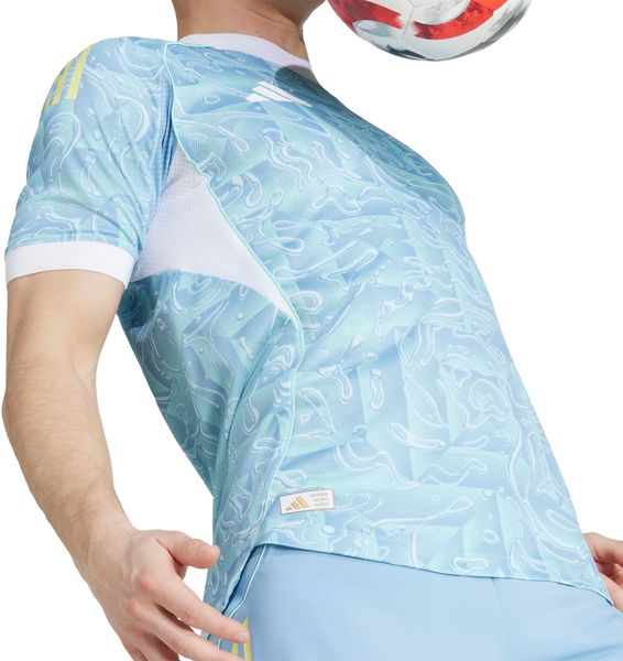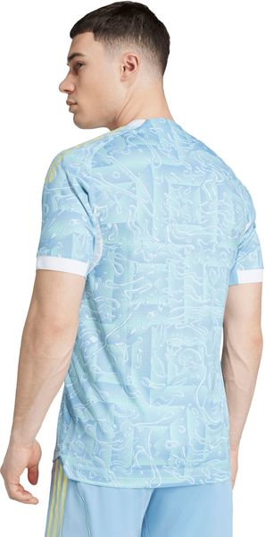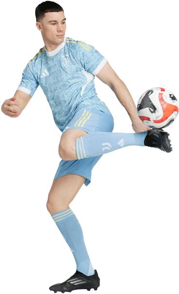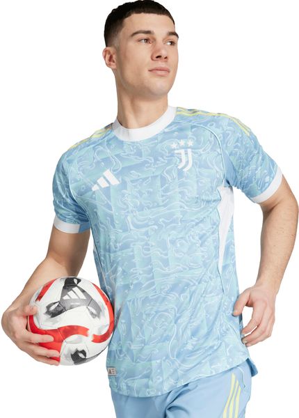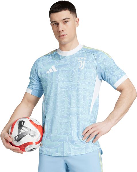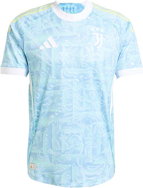 "Experience the new football season in all its glory with the Juventus 25/26 Auswu00e4rts Authentic jersey from adidas. Combining stylish blue pastels with yellow and white accents inspired by the Turin city flag, this jersey is sure to turn heads on and off the pitch. The slim fit and classic crew neck offer a modern fit that combines both comfort and style. Made from 100% recycled polyester, this jersey not only stands for athletic performance, but also for sustainability and environmental awareness."