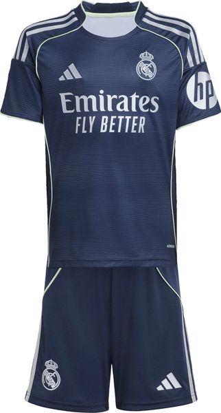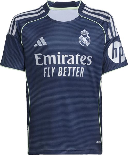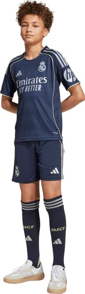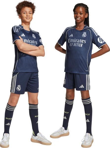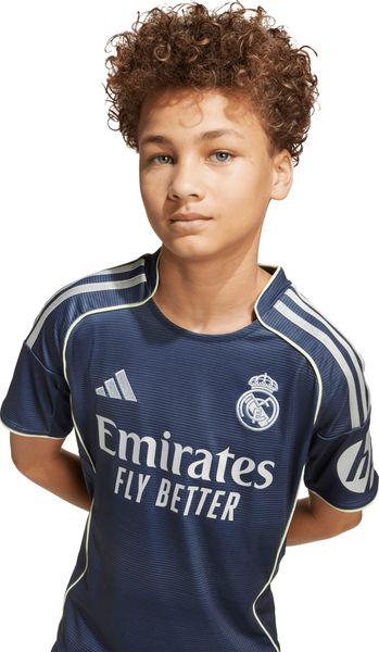 "Stylish away kit for young Real Madrid fans with sustainable polyester and moisture-regulating AEROREADY technology."