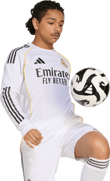 "The authentic Real Madrid home jersey for the 25/26 season from adidas pays homage to the latest renovation of the iconic Bernabu00e9uu stadium. With its slim fit and classic crew neck, this jersey not only offers a perfect fit, but also a connection to the stadium's rich history. The subtle shapes, textures and colors are a nod to the Bernabu00e9u's legendary past, making this jersey a must-have for any true fan."