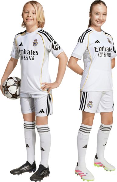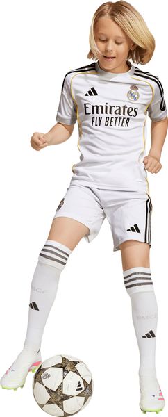 "The Real Madrid 25/26 Home Kids Kit from adidas lets young fans follow in the footsteps of their idols. This set, consisting of jersey, shorts and socks, pays homage to the iconic Bernabu00e9u stadium, which has reinvented itself time and time again throughout its impressive history. The regular fit and classic crew neck offer optimum comfort, while the embroidered Real Madrid club logo expresses pride in your favorite club."
