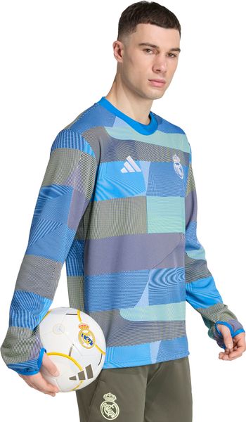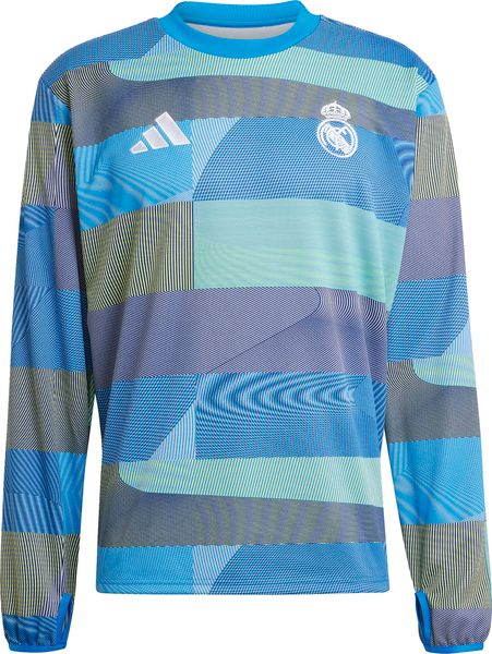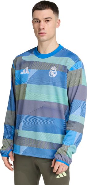 "Experience the comfort and style of the pros with the Real Madrid 25/26 Pre-match Warm Top from adidas. This dynamic football top is inspired by the new look of the Bernabu00e9u stadium and offers you optimal comfort on cold match days. Made from 100% recycled polyester, it combines sustainability with functionality. The regular cut and round neckline ensure a comfortable fit, while the long sleeves and thick double knit material keep you warm. The AEROREADY technology absorbs moisture and keeps you pleasantly dry. Practical cuffs with thumb openings offer additional comfort and the embroidered Real Madrid club logo shows your support for the team."