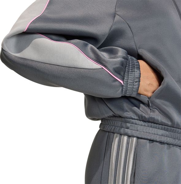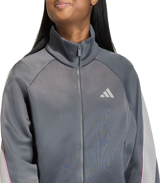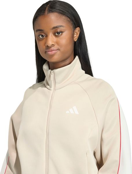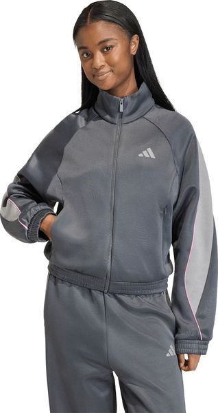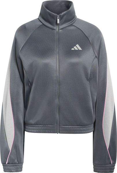 "Comfortable adidas training jacket with satin piping and zippered pockets, ideal for sports and leisure."
