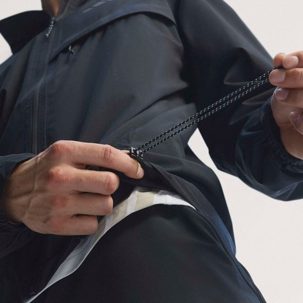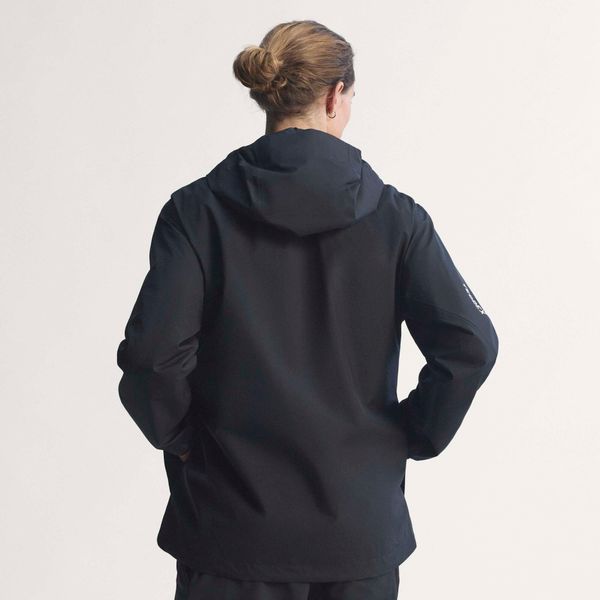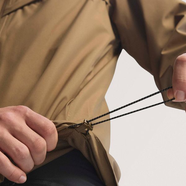 "Made from 100% recycled polyester and thermoplastic polyurethane, this jacket not only focuses on functionality, but also on sustainability. The regular cut and single-weave material ensure a comfortable fit, while the full-length front zip and adjustable hem with bungee cord and stoppers allow for an individual fit. The partially elasticated waistband offers additional protection and comfort."