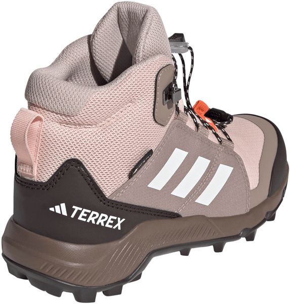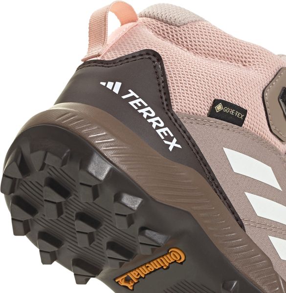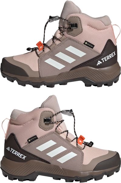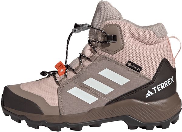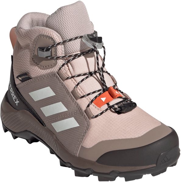 "The Terrex Mid Gore-tex hiking boot from adidas Terrex is the ideal choice for little adventurers who love to explore the great outdoors. Equipped with a waterproof and breathable GORE-TEX membrane, this shoe keeps feet pleasantly dry even in wet and muddy conditions. The upper material combines textile and synthetic leather with abrasion-resistant overlays, which gives it exceptional durability and makes it ideal for rough outdoor use."