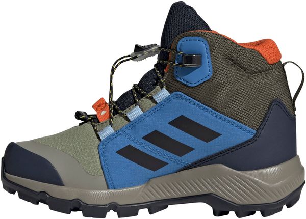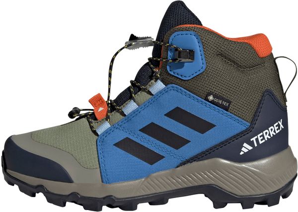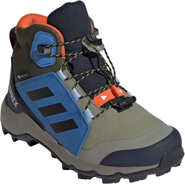 "The Terrex Mid Gore-tex hiking boot from adidas Terrex is the ideal choice for little adventurers who love to explore the great outdoors. Equipped with a waterproof and breathable GORE-TEX membrane, this shoe keeps feet pleasantly dry even in wet and muddy conditions. The upper material combines textile and synthetic leather with abrasion-resistant overlays, which gives it exceptional durability and makes it ideal for rough outdoor use."