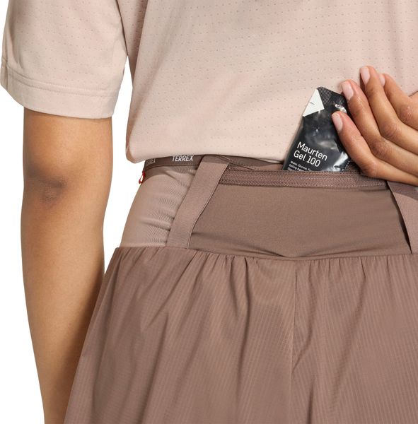 "A particular highlight of the Terrex Xploric shorts is the integrated back pocket with zipper, which offers enough space for small items. The shorts are also equipped with an inside pocket, ideal for gels or other small items on long tours. The side slits guarantee unrestricted freedom of movement so that you can concentrate fully on your adventure"