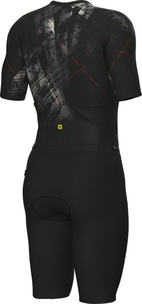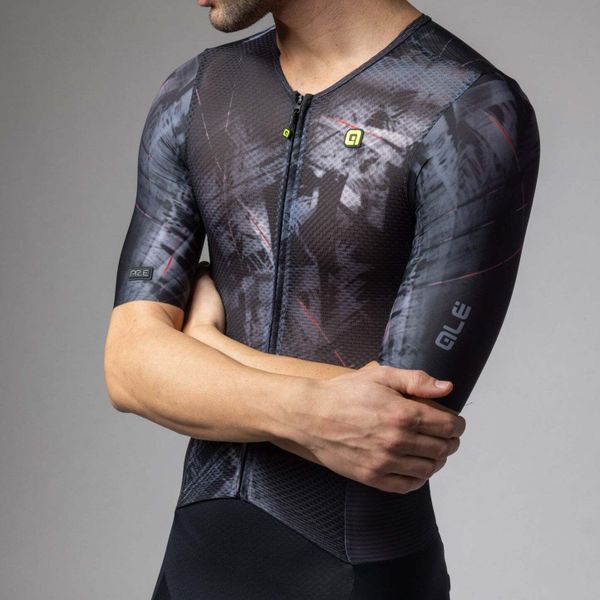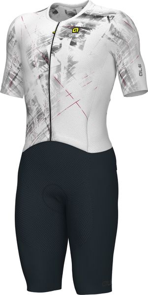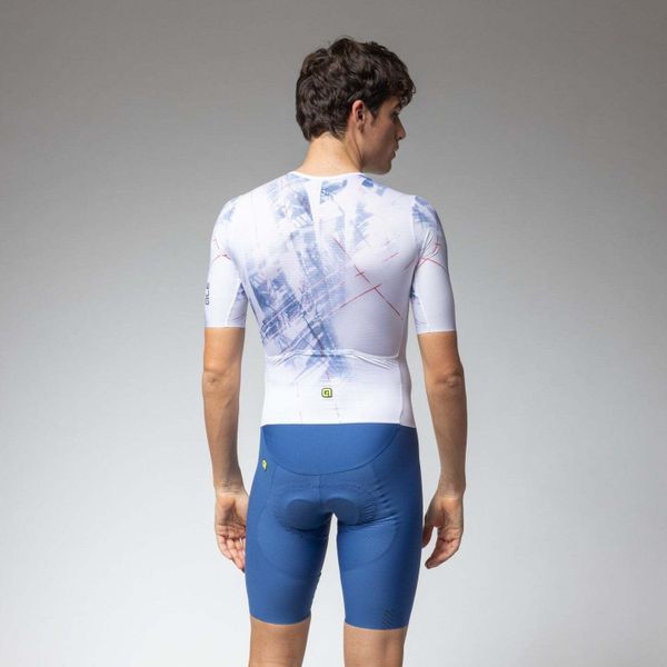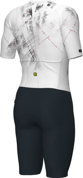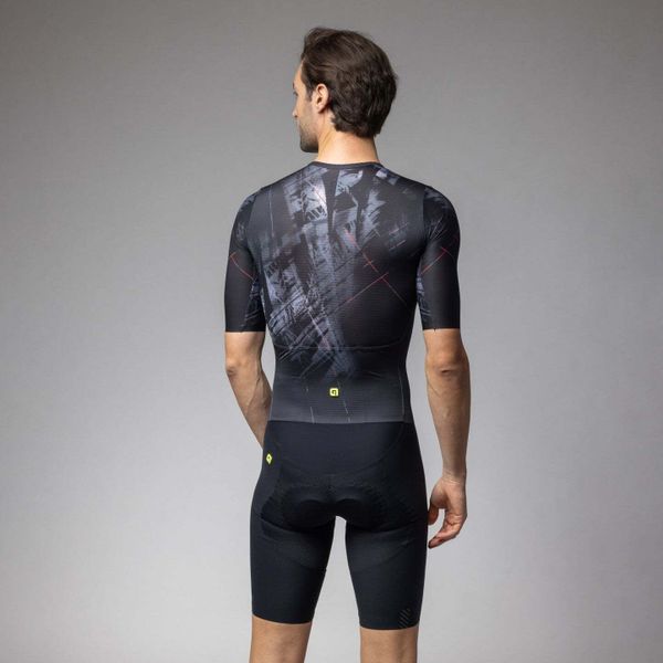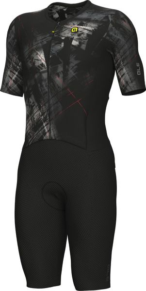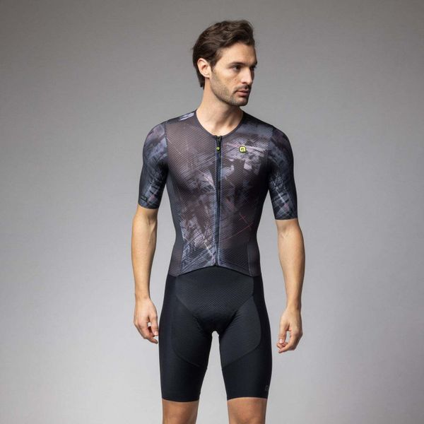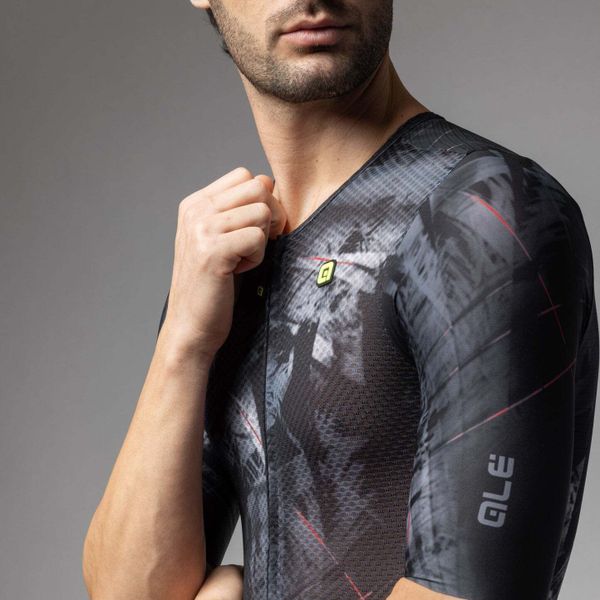 Experience the perfect combination of aerodynamics and comfort with this cutting-edge skinsuit from Alé, designed specifically for cyclists. The men's garment is characterized by its reflective properties and offers an excellent fit thanks to advanced fabrics and body mapping technology. The raw-cut tubular sleeves and raw-cut finish ensure a seamless transition and minimize drag, while the full-length front zipper allows for easy handling.