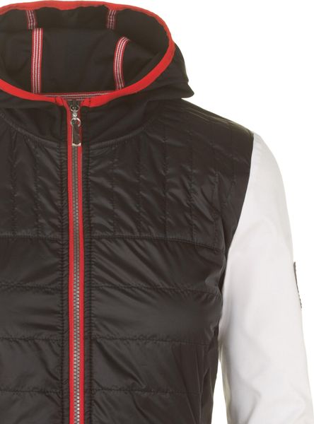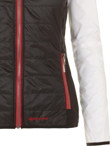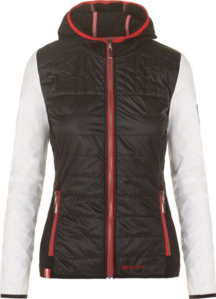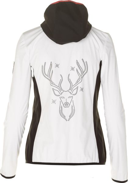 "The studded lace hooded jacket from Almgwand combines stylish design with a functional mix of materials and is ideal for everyday wear and skiing. The jacket offers excellent thermal insulation thanks to the light padding at the front, while the elasticated, windproof sleeves, sides and back ensure optimum comfort. A stylized stag made from innovative print material gives the back a special accent"