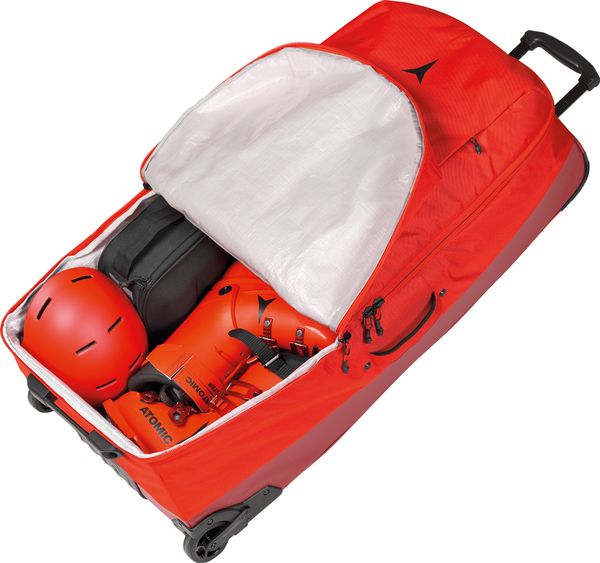 "The Atomic Redster Trunk 130L is the ultimate travel bag for adventurers and frequent travelers. Developed with feedback from Atomic athletes, this durable bag provides ample space and protection for your gear when traveling around the globe. With an impressive capacity of 130 liters, it is ideal for long journeys and transporting extensive equipment. The bag has a large main compartment and a special, water-repellent compartment that offers space for two pairs of ski boots, while numerous mesh pockets provide additional organization."
