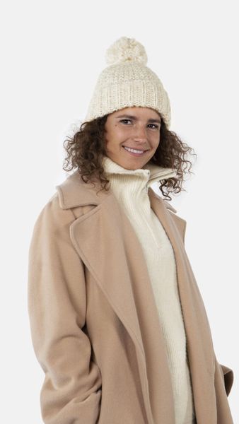 - "Chunky knit for women 3% wool Subtle melange effect Pom at the top Fleece lining on the headband for added comfort and warmth at the cuff": 8 cm