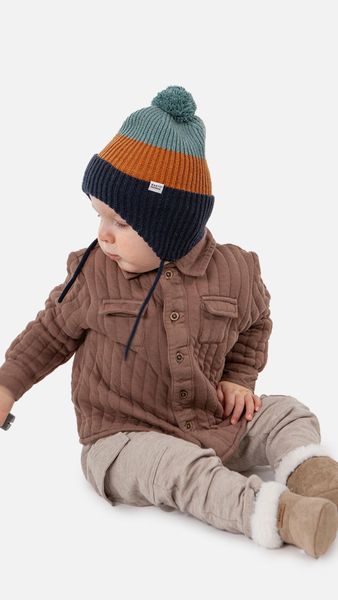 - Baby earsSleeve hat with bobble 50% recycled polyester The strap is lined with fleece Drawstrings on the sides for a secure fit Perfect for combining with the Chinty Col