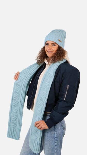 "The Farrah Scarf from Barts is the ideal companion for style-conscious women who value sustainability and comfort. This scarf is made from high-quality wool and contains 52% recycled polyester, which makes it not only environmentally friendly but also particularly soft and warm. With its classic cable knit pattern, the scarf adds a fashionable accent and can be perfectly combined with the Farrah beanie or matching headband"