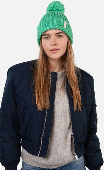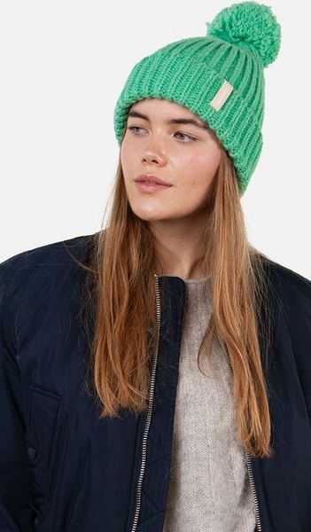 "Stylish chunky knit hat with bobble made from 50% recycled polyester for environmentally conscious women."
