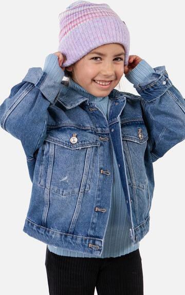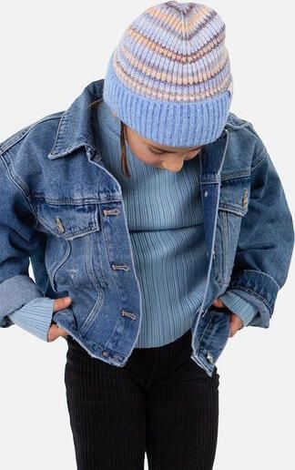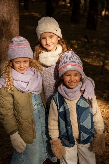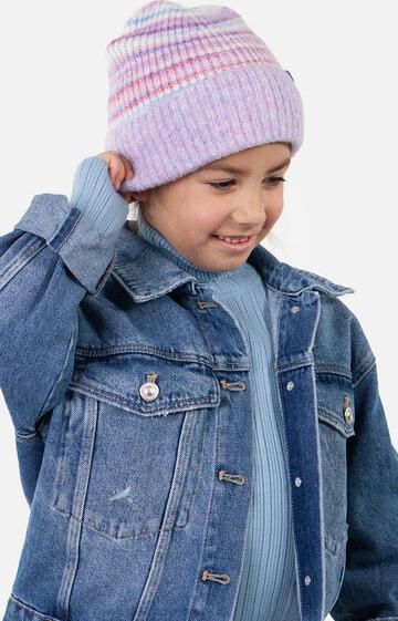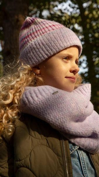- "Striped wrap hat for girls 50% recycled polyester Knitted with a shimmering yarn Lined with a fleece band for added comfort Hu00f6height of the envelope": "7 cm This product will pill all over due to the properties of this yarn, it can be removed by hand or with a depiller"