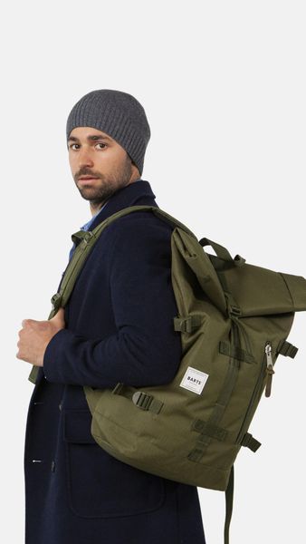 - "Sporty backpack 100% polyester roll-top opening with press stud fastener Adjustable shoulder straps and additional zipped pocket on the front Large laptop compartment (46 x 29 cm) on the back on the inside Mau00u00dfe": "47 x 29 x 15 cm (height x width x depth) 26 L"
