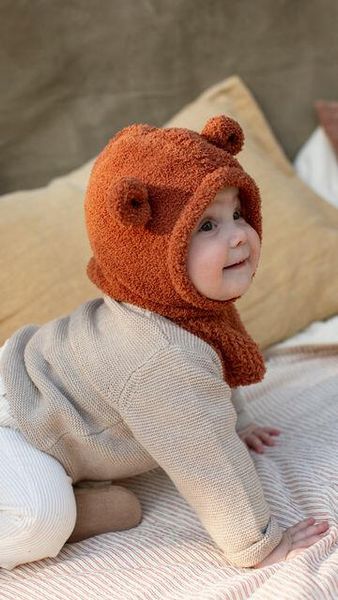 "Soft baby balaclava made of teddy fabric with fleece headband for extra warmth and cute ears for stylish comfort."
