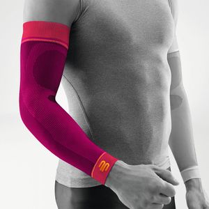 "Experience a new dimension of athletic performance with the Sports Compression Sleeves from Bauerfeind. These innovative compression sleeves promote improved blood circulation, which decreases from the wrist to the upper arm, thus ensuring more power, greater endurance and shorter recovery times. The special medically effective compression ensures that the muscles are optimally supplied with oxygen, which increases performance and speeds up regeneration. In addition, the arm muscles are quickly warmed up, which minimizes the risk of injury"