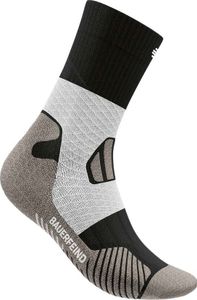"The Trail Run Mid Cut Socks from Bauerfeind are the ideal choice for outdoorenthusiasts who are speed hiking or running in the terrain. These socks were developed in collaboration with professional trail-Lu00e4runners and offer optimum protection against u00dcoverload thanks to the innovative u201eInfinity Zone X-TREMEu201c. This zone protects the ankle joint and the foot arch, while the special compression zone on the ankle provides additional stability. This ensures a secure step even on rough pathsu00e4u00e4."