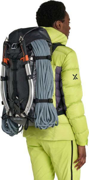 "The backpack offers versatile customization options, so you can configure it to your specific needs by adding or removing elements such as attachment points for skis and ice axes. The redesigned shape of the backpack ensures greater stability and optimum load distribution, while the top opening and zippered lid on the back allow quick and easy access to your equipment."