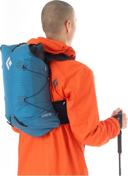 "Thanks to the BD SETT (Stitchless Edge Taping Technology), the Distance 15 offers an improved fit and durability. The barely stretchable edge taping and the soft, breathable Diamond Mesh construction ensure that the backpack is comfortable against the skin, even during intensive activitiesu00e4ten. The soft flask holders and additional front pockets provide secure storage space and increase the safety of your equipment."