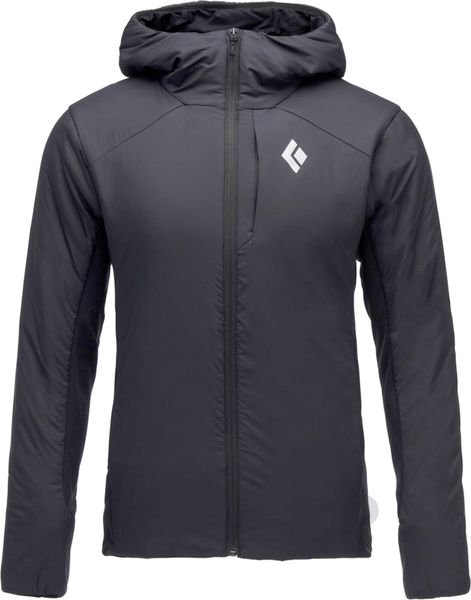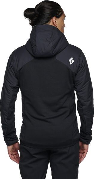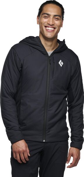 "The M First Light Hybrid Hoody by Black Diamond is the ideal choice for men looking for a versatile, urban and work-friendly midlayer. This innovative jacket combines the benefits of PrimaLoftu00u00ae Gold Active insulation with strategically placed inserts of certified mulesing-free merino wool to provide excellent breathability and thermoregulation. The helmet-compatible hood and reworked design ensure an optimal fit and freedom of movement, while the 20D stretch nylon ripstop outer fabric with a PFC-free DWR coating protects against unexpected weather conditions."