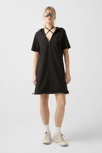 "The Valerie hoodiedress in a loose fit and with an adjustable hood is a comfortable piece u2013 complemented by a drawstring hem and finely perforated sections. Short sleeves, a logozipper and side pockets highlight the style, while durable water-repellent 4-Way stretch fabric provides a functional finish"