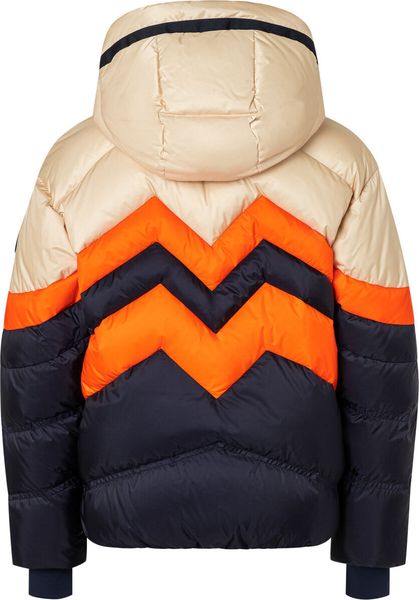 "The detachable hood with ribbed tape details and reflective mesh lining is particularly practical and, together with the padded stand-up collar and elasticated snow skirt, provides additional comfort and protection. The long sleeves with inset cuffs and thumb loops ensure a perfect fit and freedom of movement. The Bzipper with BOGNERtrim guarantees easy fastening, while the numerous pockets, including a ski pass-compatible zipped pocket on the sleeve, offer plenty of storage space"