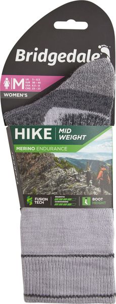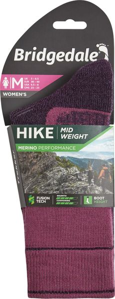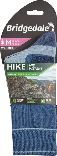 "The Hike Midweight Performance Boot from Bridgedale is the ideal companion for anyone who is out and about on extended hikes, expeditions or trekking tours. Designed specifically for women, this sock offers an unparalleled level of comfort and functionality that will satisfy even the most demanding adventurers. With Merino Performance Fusion Technology, an optimal balance between cushioning, insulation and moisture management is achieved, keeping you dry and comfortable all day long."