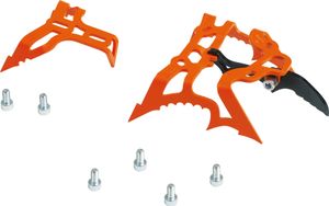 "The front part of the crampon, equipped with five points, is securely fastened to the boot with four screws. This design allows a rotation range of +/- 3 degrees, which enables precise fine adjustment of the frontal point position. The rear part of the crampon, which is equipped with three prongs, is fixed with two screws and offers a longitudinal adjustment range of 10 mm. This adaptability ensures an optimal fit and performance, especially on demanding ice surfaces."