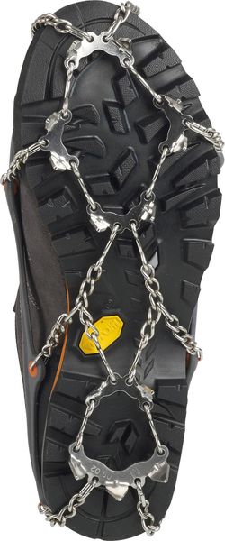 "The Ice Master Light from C.A.M.P. is the perfect combination of lightness and performance for anyone who wants to move safely on snow, ice and slippery terrain. With its 13 robust stainless steel spikes evenly distributed across the sole surface, it guarantees a firm grip and precise traction. These gru00u00f6del are ideal for mountaineering, alpine tours and hiking and prevent dangerous slips on challenging surfaces such as mud, wet grass or lichen-covered rocks"
