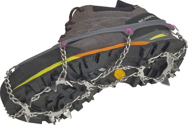 - Lightweight grödel that provides grip on snow, ice and low grip terrain