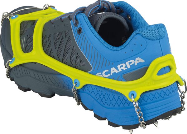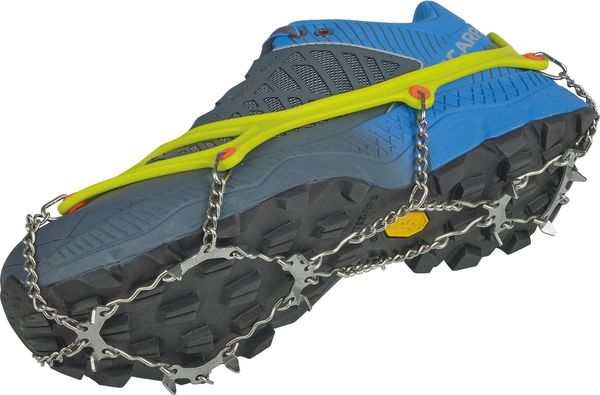 "Discover the ICE Master Run Gru00f6del from C.A.M.P, the ultimate lightweight for winter running and mountain adventures. With its 13 evenly distributed 8-mm stainless steel spikes, it offers exceptional grip and stability on snow, ice and slippery surfaces such as wet grass or rocky terrain. This sophisticated construction ensures precise traction that effectively prevents dangerous slips without compromising walking comfort."