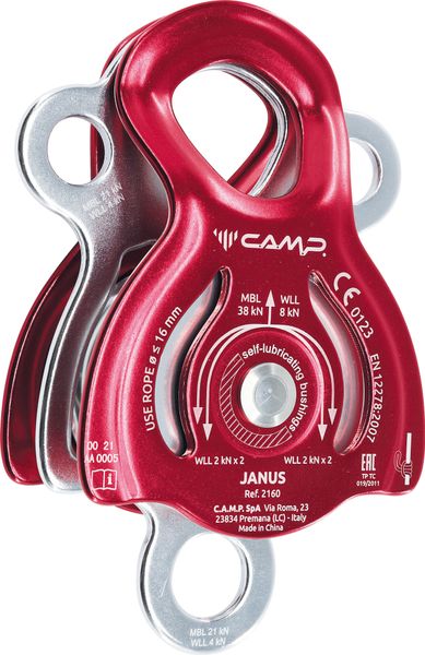 "The Janus double rope pulley from C.A.M.P. is an indispensable tool for demanding tasks where stability and versatility are required. This u00e4uu00extremely robust rope pulley is specially designed for the installation of rope bridles and the execution of complex manu00f6euvers. Thanks to its generously dimensioned double pulley, it is ideal for very high loads. With a mainu00d6se that offers space for three carabiners, as well as two additional side u00d6se and a larger lower u00d6se, the Janus offers numerous fastening options and ensures maximum flexibilityu00e4t during use."