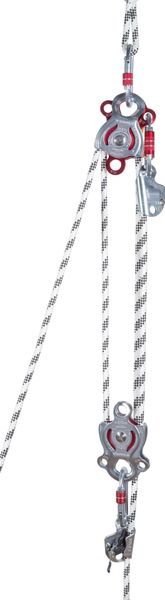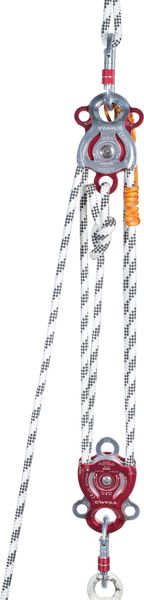 "Versatile double pulley with ball bearings for high efficiency and stability with heavy loads and complex maneuvers."