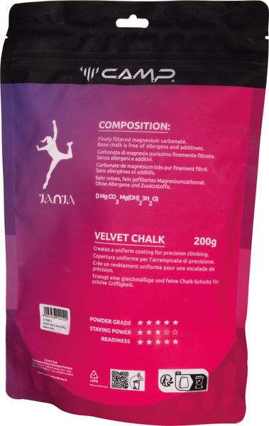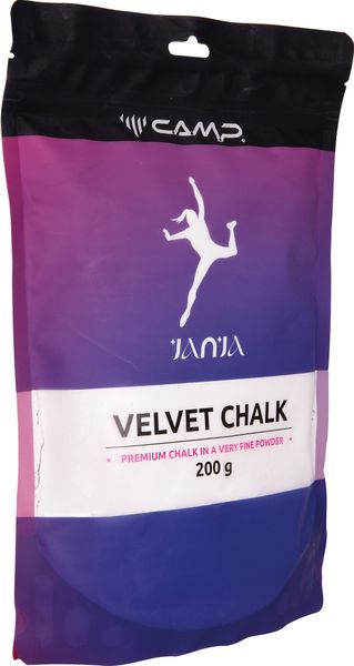 "The Velvet Chalk Janja 200 g from C.A.M.P. is a high-quality, super-fine chalk powder that has been specially developed for climbing enthusiasts. It offers uniform coverage that supports precise climbing and is therefore ideal for challenging routes. Thanks to its fine texture and even distribution, it enables quick and effective rechalking, which is particularly advantageous for onsight climbing."