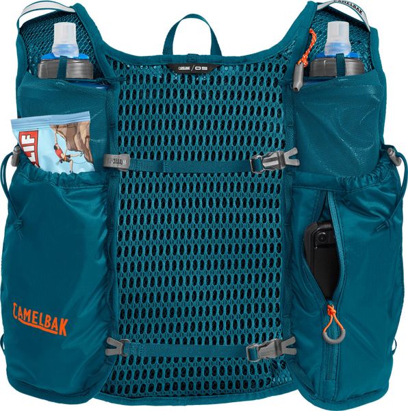 "Thanks to the innovative 3D-Vent-Mesh design, airflow is maximized, which significantly increases comfort while running. The two-way adjustable chest straps guarantee a perfect fit and ensure that the vest sits comfortably all day long. Practical stretch-u00dcover pockets provide ample space for snacks and other essentials, while the secure phone pocket keeps your cell phone within easy reach at all times."