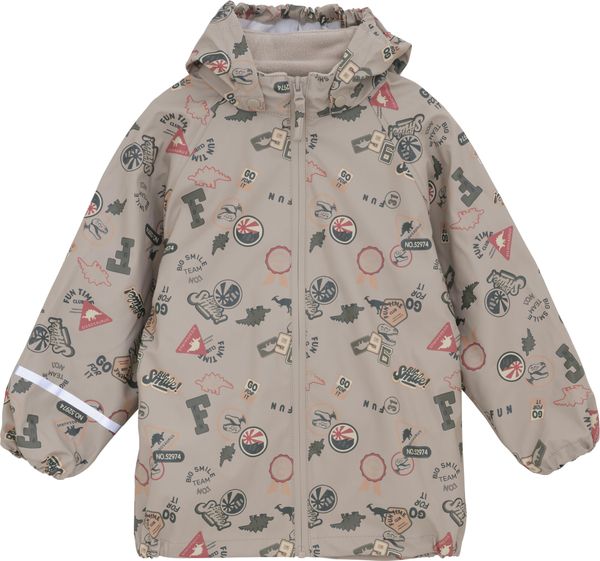 "Stylish, waterproof rain jacket with reflective details and adjustable hood, made from 66% recycled material."