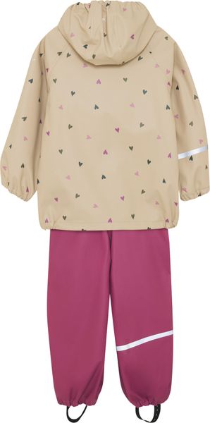 "With an impressive wateru00e4ul pressure of 10,000 mm, your child will stay dryeven in heavy rain. This set is not only functional, but also environmentally friendly: it is made from 66% recycled material and is GRS-certified (CERES-0366), making it a sustainable choice for environmentally conscious parents"