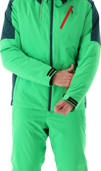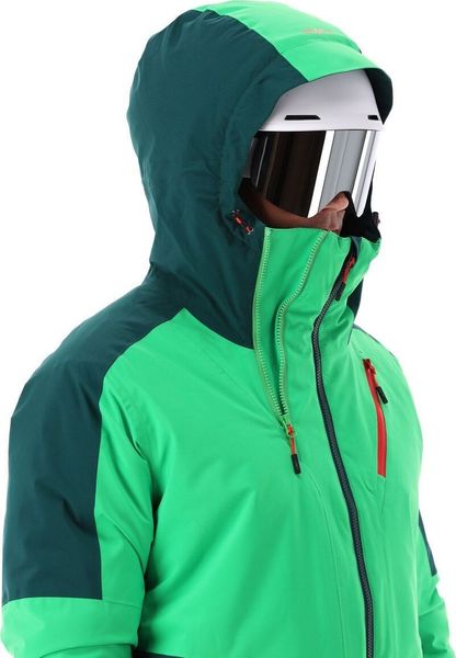"The fixed hood with double front zipper allows an extended structure that supports the wearing of a helmet and thus offers additional protection in extreme conditions. Practical details such as adjustable Lycracuffs, a snow guard and a total of five pockets u2013 two on the side with zippers, one on the chest, one on the inside and a special ski pass pocket on the sleeve u2013 round off the functionality of the jacket."